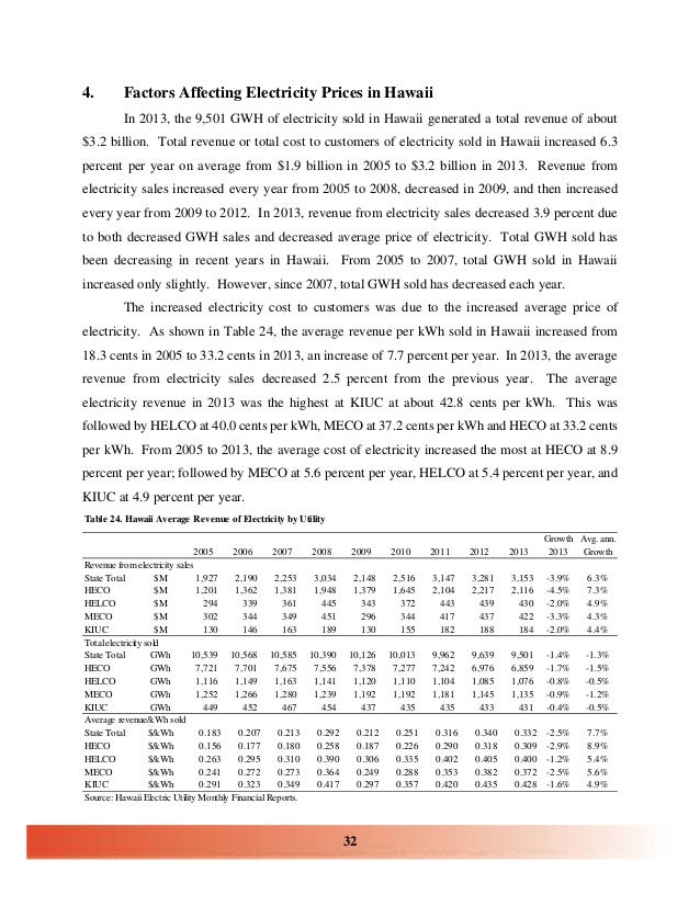 Hawaii's Electricity Industry: 2014 Analysis and Recent Trends September 2015 . 2 Kauai consumers paid the highest electricity rate at 41.6 cents/KWH, How have the factors affecting electricity prices changed over time? ... Fetch This Document